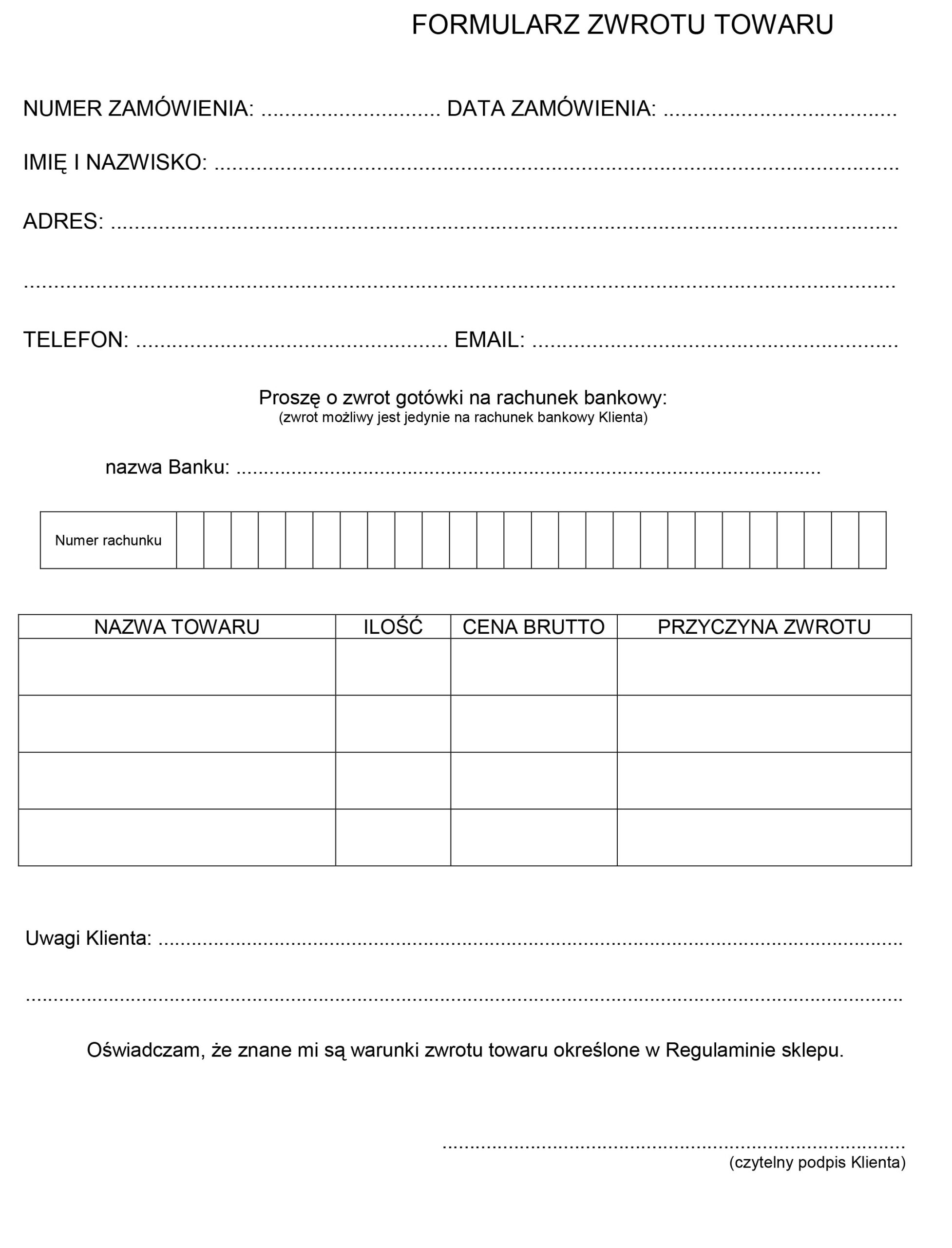 Prosimy o wypełnianie formularza DRUKOWANYMI LITERAMI. Prosimy, aby zwracany towar był odpowiednio zabezpieczony tak, by nie uległ uszkodzeniu w trakcie transportu. Informujemy, że sklep internetowy skino.pl nie przyjmuje przesyłek wysłanych za pobraniem.